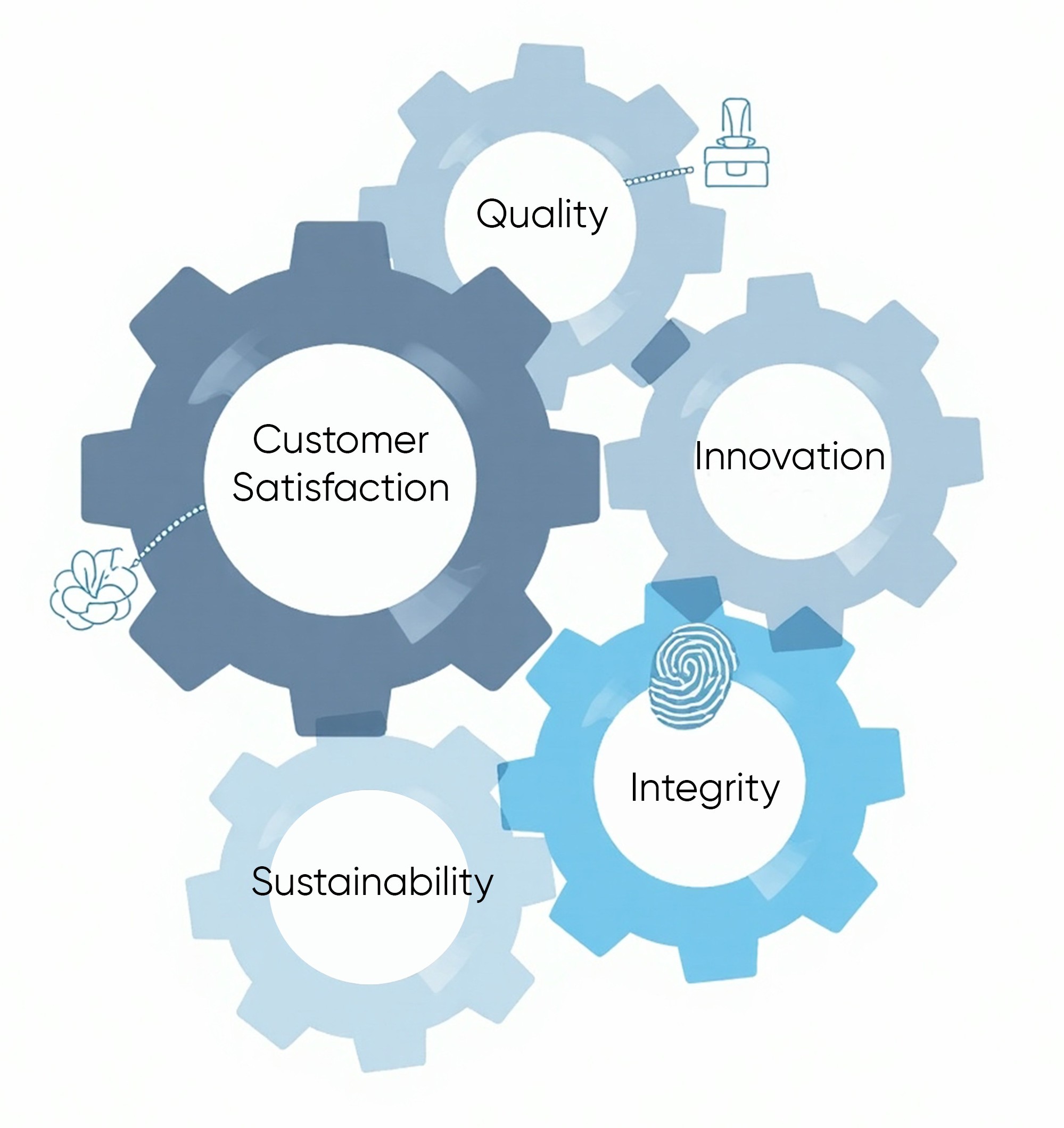 - Quality: Commitment to maintaining the highest standards in all products and processes.